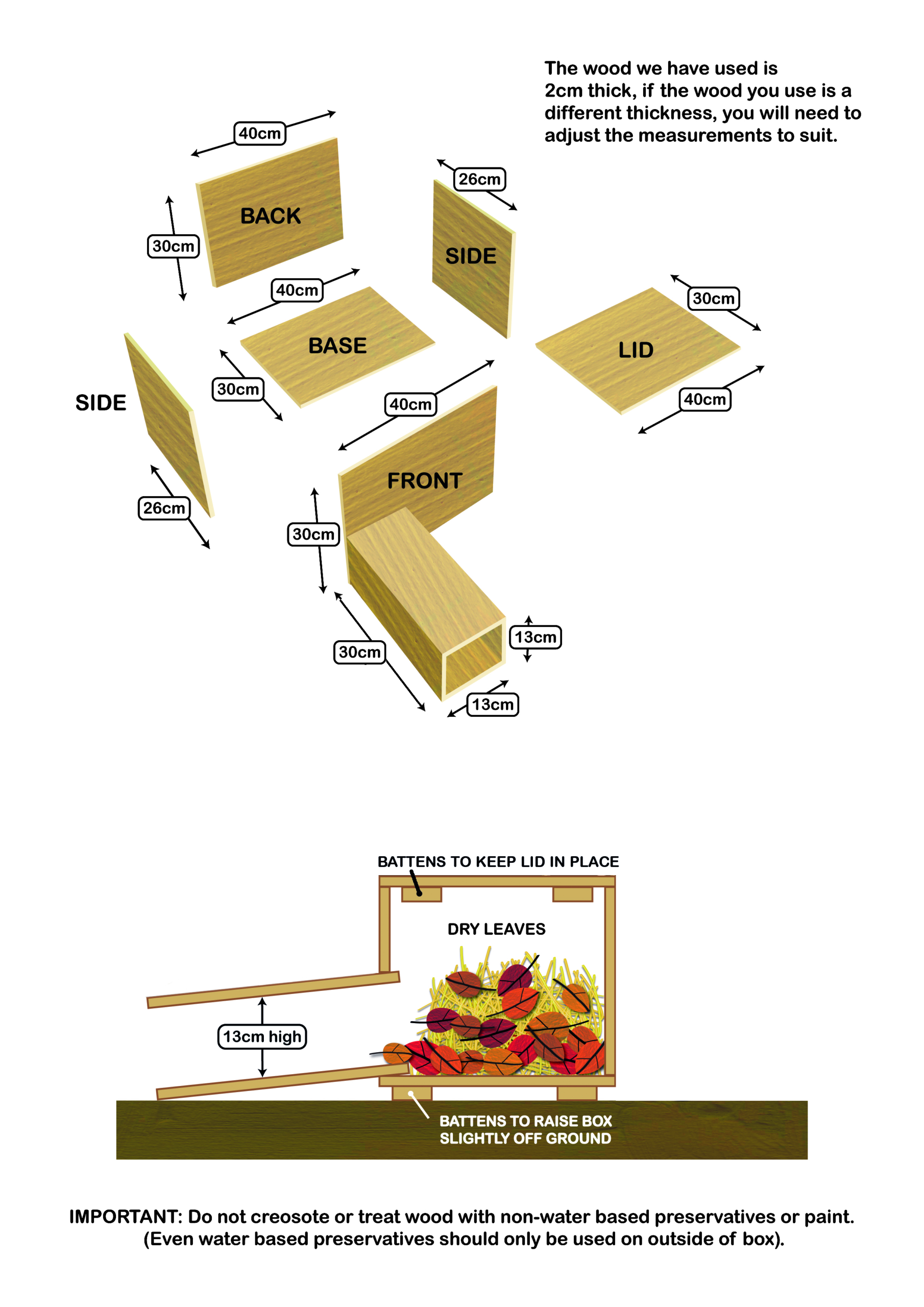 On no account should the hedgehog house be creosoted or treated with non-water based preservatives or paint as the fumes remain for a long time and can be very harmful. If used, water-based preservatives should be on the outside of the box only.